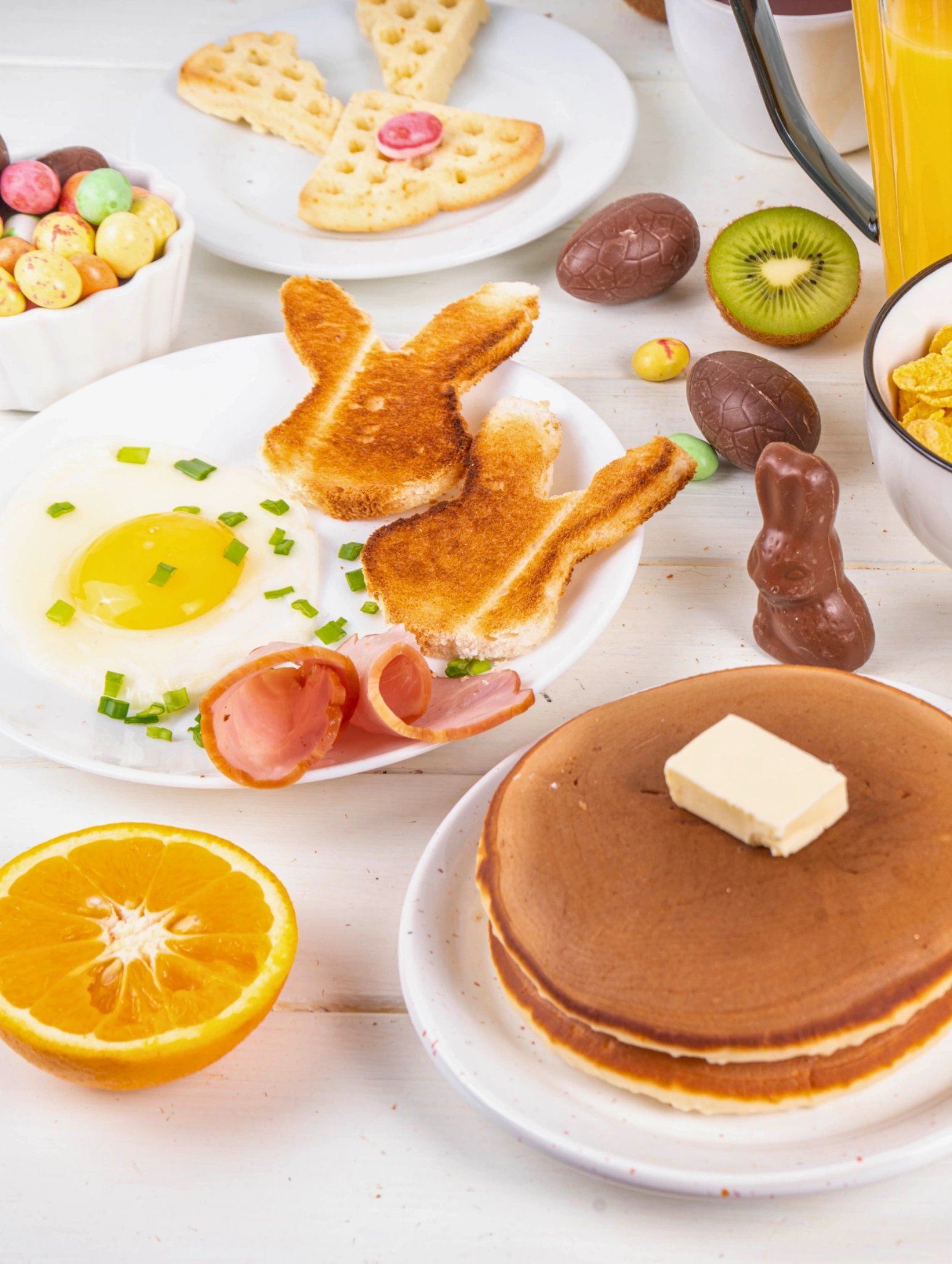 The centerpiece of an Easter brunch is typically a ham, but other options include frittatas, quiches, savory bread puddings, waffles, and pancakes. And there’s no need to stop there; combine many, particularly if there is a crowd.