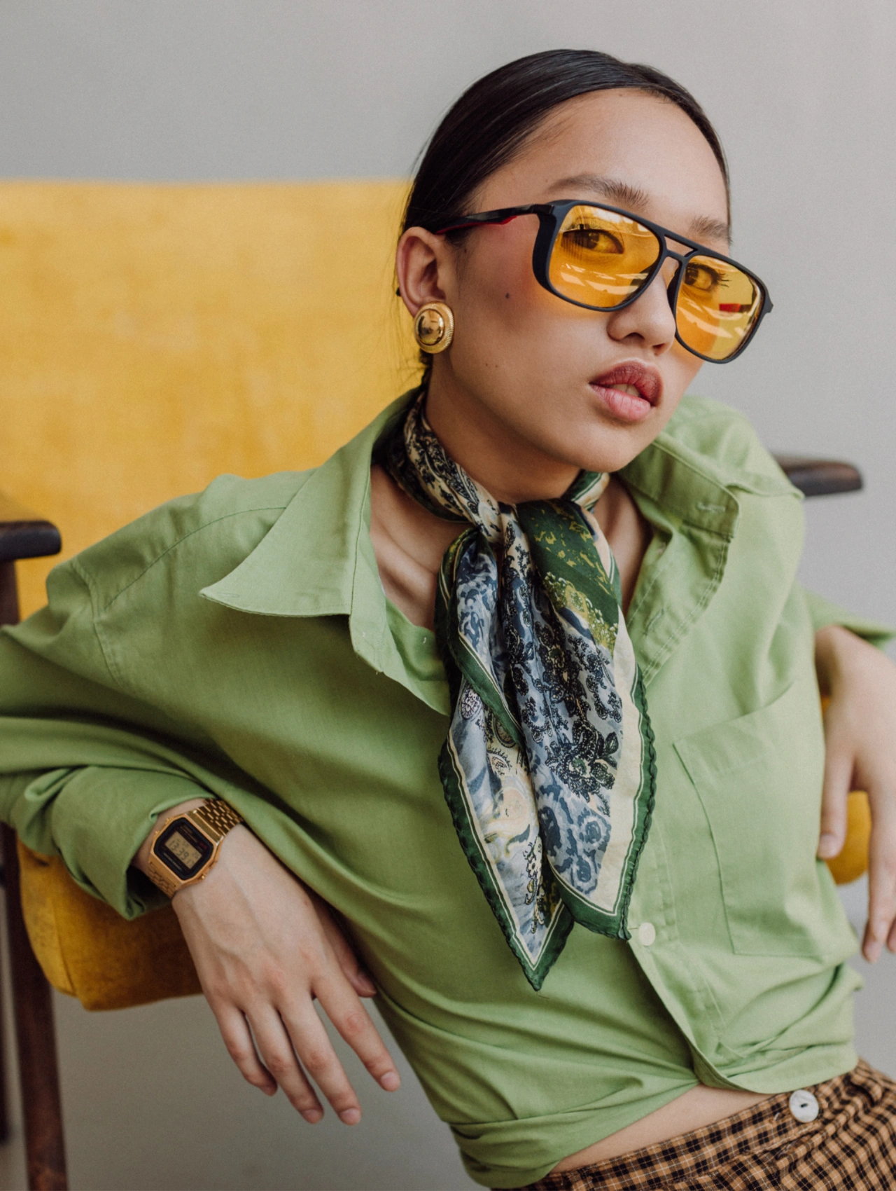 Una camisa oversized con gráficos llamativos y pantalones de tela negros forman un equilibrio entre casual y sofisticado para este look primaveral. Para un toque moderno, agregue aretes dorados con colores de Daniela Salcedo, gafas de aro negras con lentes de color y zapatillas Adidas Tenis SL amarillas. Incluye un bolso negro con detalles dorados para completar. ¡Perfecto para salir a la luz esta temporada!